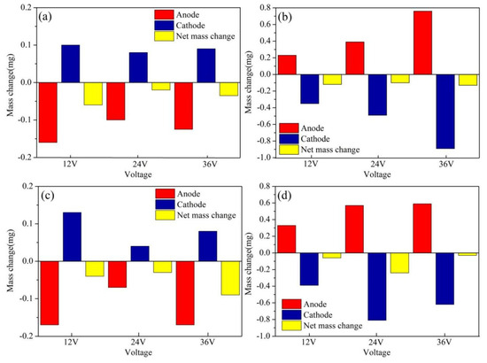 Mass change in the eroded anode and cathode for (a) Pt–10Ir and (b) Pt–10Ir–1Y, (c) Pt–25Ir and (d) Pt–25 Ir–1Y contact materials.