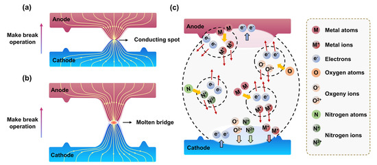 As we all know, arc erosion is an extremely complicated multi-physics coupling problem that involves numerous disciplines, including heat, fluid mechanics, electromagnetic, and electrodynamics, as we are all aware. The two fundamental components of the arc erosion process are the arc properties and their overall impact on the thermal stress, gas pressure, the electromagnetic force on the surface of the molten pool, and the material’s reaction to the arc’s heat and force. Arc energy, arc duration, welding force, and electric contact resistance are the key factors influencing the physical phenomena of the electric contact formed during arc erosion [28,29,30]. Among them, in the process of arc erosion, with the change in some conditions, such as materials, its physical phenomenon also changes accordingly.