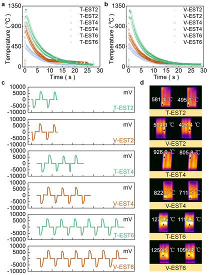 As shown in Figure 3, the temperature distribution around the specimens at the maximum temperature is received from the infrared thermal imager data corrected with FotricAnalyzIR software. Under the same environmental condition, the higher the Joule heat generated by EST, the greater the thermal radiation energy. As depicted in Figure 3a–f,a1–f1, the thermal radiation energy of T-EST2 and T-EST4 is higher than that of V-EST2 and V-EST4, respectively, indicating that the temperatures of T-EST2 and T-EST4 are higher than that of V-EST2 and V-EST4, respectively. The thermal radiation energy of T-EST6 shows no significant difference from that of V-EST6. The phenomenon is consistent with the temperature variation depicted in Figure 2d. The results conclude that the Joule heat effect of EST is not only related to time but also to the direction.