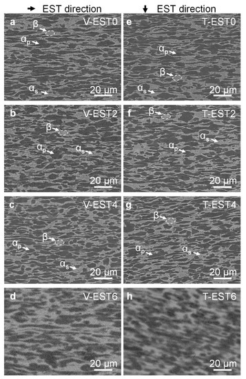 The increase of specimen temperature under EST inevitably affects the evolution of microstructure. As depicted in Figure 4a,e, the microstructure of V-EST0 and T-EST0 is consisted of the lath primary α phase (αp) in black and β phase in white before EST, and acicular αs phase (seen in Figure 5 clearly) is distributed in β phase. These α and β phases were distributed along the V-EST direction (Figure 1c) because of the extrusion of the raw material. To study the influence of EST direction on microstructure, the same characterization sections of group No. 1 (Figure 1c) and No. 2 (Figure 1d) were selected for comparison. The microstructures of V-EST0 and T-EST0 are similar due to the same characterization section. When the T-EST is carried out for 0.02 s, the microstructure variation of V-EST2 and T-EST2 is not significant (Figure 4b,f) and the lath-like αp phase gradually transforms into equiaxed αp phase. The equiaxed phenomenon is more obvious in T-EST2 which is ascribed to the higher temperature of T-EST2 during EST (in Figure 3d,d1). As the EST time increased to 0.04 s, the area of β phase increased (shown in Figure 4c,g). The energy concentration in V-EST4 and T-EST4 during EST increased the temperature of the specimens significantly. The specimen temperature range of V-EST4 (711.7–822.0 °C) and T-EST4 (805.8–926.9 °C) reached the α → β phase transition point as EST of 0.04 s [29]. Hence, the decrease in black area (αp phase) in T-EST4 is more obvious than that of V-EST4, which indicates that more αp phases in T-EST4 transform into β phase compared with that in T-EST4. The αp phases in T-EST2 and T-EST4 show a more obvious equiaxed shape. When EST time increased to 0.06 s, it can be found that the more obvious phase transformation in V-EST6 and T-EST6 occurs, depicted in Figure 4d,h. The main reason is that the maximum temperatures of V-EST6 (1096.4–1250.5 °C) and T-EST6 (1114.3–1270.5 °C) exceed the temperature of the β phase transformation point; both αp phase and β phase undergo phase transformation, and then a large number of needle-like αM phases are precipitated during cooling. The morphology of αM phase cannot be observed because of the low magnification of Figure 4, which will be characterized and discussed in Figure 5. The phase transformation process under the action of EST was reported in previous work [29]. The microstructure evolution of alloy is related to the solution temperature and the cooling rate during heat treatment. Comparing the microstructures of V-EST6 and T-EST6 shown in Figure 4d,h, different microstructures are formed under different EST directions with the same time, but the temperature of V-EST6 and T-EST6 shows no obvious difference. The αp areas (black area) in T-EST6 is equiaxed which is more than obviously lath αp areas (black area) in V-EST6.
