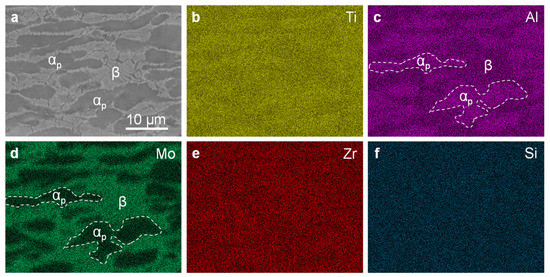 EDS analysis of a specimen of middle area before EST; (a) SEM image; (b–f) the elements distribution (in (a)) of Ti, Al, Mo, Zr, and Si, respectively.