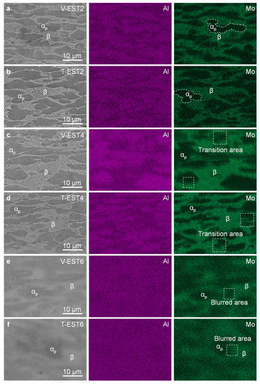 Phase transition is accompanied by the diffusion of elements [38]. The element distribution of specimens is characterized via EDS under different EST directions. Because V-EST0 and T-EST0 are carried out before EST and the characterization sections are the same, the results of the specimen element distribution are similar. As shown in Figure 6, the specimen mainly contains Ti, Al, Mo, Zr, and Si elements, in which Al is the stable element of α phase, Mo is the stable element of β phase, and Zr and Si are neutral elements. Less Mo elements and more Al elements are distributed in the αp phase area, and more Mo elements and fewer Al elements are in the β phase area. The Zr and Si elements are evenly distributed. The clear dividing line (marked by a dotted line) between Mo and Al elements at the α/β phase interface can be observed. To further explore the element distribution of specimens under different EST directions, the distributions of Mo and Al in V-EST2, V-EST4, V-EST6 and T-EST2, T-EST4, T-EST6 are shown in Figure 7. As an EST time of 0.02 s applied, the distribution of Mo and Al elements in V-EST2 and T-EST2 show no obvious variation (Figure 7a,b), mainly because the temperature of EST is not enough to promote the obvious phase transformation in the T-EST2 and V-EST2. When EST time increased to 0.04 s, the temperature in V-EST4 and T-EST4 exceeded the temperature of α phase transition due to energy concentration. The Mo and Al elements in V-EST4 and T-EST4 begin to diffuse, as shown in Figure 7c,d, and form an element transition area at the interface (marked with a dotted rectangle). The result is consistent with some αp phase in V-EST4 and T-EST4 transforming into β phase, shown in Figure 4c,g. Increasing EST time to 0.06 s, a higher temperature formed in V-EST6 and T-EST6 during EST which promoted the drastic phase transformation between α and β phases. The Mo and Al elements diffuse, as depicted in Figure 7e,f, and the clear element distribution dividing line becomes blurred, which cannot be observed at the αp/β interface (marked with a dotted rectangle). The study has shown that the diffusion of Mo from β phase to α phase promotes the precipitation of αM phase [29] and that the addition of Mo promotes the precipitation of a nano-martensite phase, increasing the volume fraction of martensite [39]. Different from the V-EST6, the diffusion phenomenon in T-EST6 is more obvious. The phenomenon can be confirmed in Figure 4d,h; the number of αM phases precipitated in T-EST6 is more than that in V-EST6, and the distribution of αM phases is more uniform than V-EST6 which indicates the phenomenon of element diffusion accompanied by phase transformation is more obvious in T-EST6. The results indicate that the phase transformation of TC11 alloy under different direction EST is accompanied by different degrees of element diffusion.