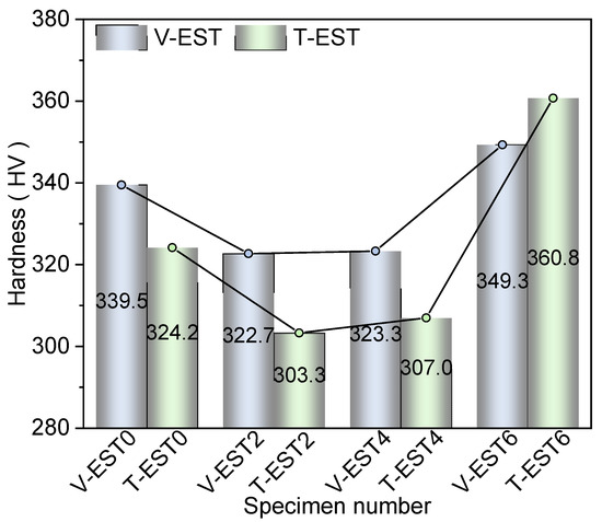 To explore the influence of different EST directions on the mechanical properties of TC11 alloy, the Vickers hardness of specimens under different direction EST was tested. The four points in the middle area (shown in Figure 1c,d) are used to conduct the Vickers hardness test. As shown in Figure 8, the average Vickers hardness (calculated as the average value of four points) of V-EST0, V-EST2, V-EST4, and V-EST6 are 339.5 HV, 322.7 HV, 323.3 HV, 349.3 HV, respectively, and the average Vickers hardness of T-EST0, T-EST2, T-EST4, and T-EST6 are 324.2 HV, 303.3 HV, 307.0 HV, 360.8 HV, respectively. As shown in Figure 8, the microstructure transformation in V-EST2, T-EST2, V-EST4, and T-EST4 is not obvious compared to V-EST0 and T-EST0, but the variation of phase constitution still exists [37]. The average Vickers hardness of V-EST2, T-EST2, V-EST4, and T-EST4 show a slight drop which is attributed to the obvious phase transition of the acicular αs to β. As the EST time increased to 0.06 s, the grains are refined. The Hall–Petch relation states that the material’s yield strength increases with decreasing average grain size, and the study shows that the strength of titanium alloy may be increased by reducing the grain size [40]. The average Vickers hardness of V-EST6 and T-EST6 is improved. The precipitated fine needle-like αM phase plays the role of dispersion strengthening.