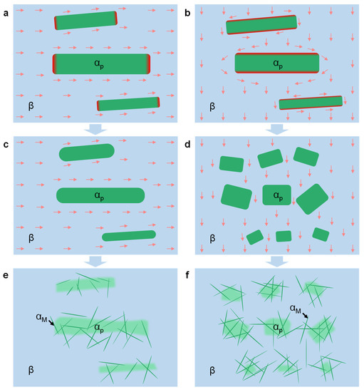 The obvious differences in Vickers hardness (Figure 8) and microstructure (Figure 4d,h) between V-EST6 and T-EST6 can be observed, and the mechanism diagram of αM phase transformation under the action of different EST directions is illuminated. The resistivity of α phase is greater than that of β phase, and the resistivity decreases when the transformation of α to β phase occurs [41,42,43]. Therefore, a different EST direction will cause different temperature variations on TC11 specimens. As shown in Figure 9a,b, the blocking effect (red area in αp phase) of acicular αp phase on the current in the specimen under T-EST is more obvious than that of the specimen under V-EST due to the difference of the first action area of different direction EST, resulting in a higher specimen temperature than that of a specimen under V-EST with the same EST time. The result is consistent with Figure 2 and Figure 3, and the temperatures of T-EST2, T-EST4, and T-EST6 are higher than that of V-EST2, V-EST4, and V-EST6, respectively. Moreover, the αp area in the T-EST6 (Figure 4h) is more than that of V-EST6 (Figure 4d) due to the different EST direction, and the αp area in the T-EST6 is equiaxed. With the increase of EST time, the α phase is gradually equiaxed under the action of V-EST, as shown in Figure 9c, while the α phase decomposed into a small α area phase under the action of T-EST depicted in Figure 9d. When the temperature of EST exceeds the β phase transition point, the αp area is the location where the αM phase precipitates in the process of rapid cooling. More αp area in T-EST6 makes it possible for more αM phase precipitation. As the temperature of EST exceeds the β phase transition point, the precipitation density of αM phase in T-EST is higher, and the distribution is more uniform compared to that of V-EST (in Figure 9e,f) which results in the specimen’s average Vickers hardness of T-EST being higher than that of V-EST. Different phase transformation occurs inside the specimen as EST is only different in the direction applied, which results in a different microstructure and mechanical property.