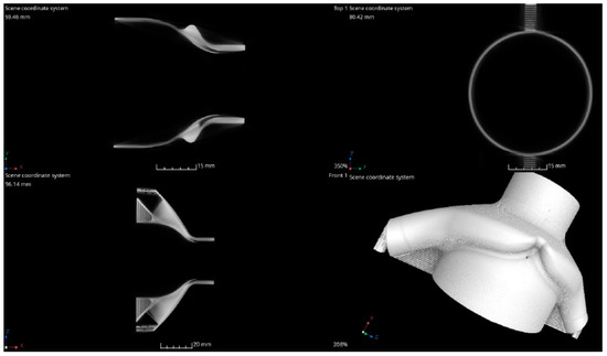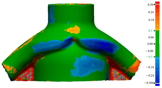- A geometrically complex ejector-type part was manufactured using the developed LPBF technology; its geometric parameters corresponded to those of the electronic models, while the base material was free of defects (microcracks or pores) sized more than 20 µm.