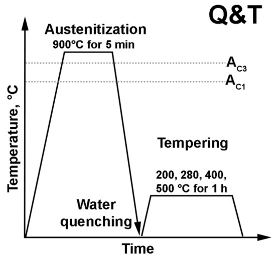 The chemical compositions of two experimental steels, denoted here as Fe-0.34C and Fe-0.44C, are listed in Table 1. These steels were produced by air induction melting followed by electro-slag remelting. Next, the steels were subjected to solution treatment at 1150 °C for 4 h, followed by forging at temperatures from 1150 to 950 °C into billets with dimensions of 60 × 150 × 450 mm3 with subsequent air cooling. Samples were subjected to austenitization at 900 °C for 5 min followed by water quenching. The pre-hold time at the austenitization temperature was 1 min per 1 mm sample thickness. Isochronal tempering was carried out at 200, 280, 400 and 500 °C for 1 h with subsequent air cooling. (Figure 1).