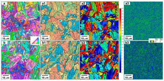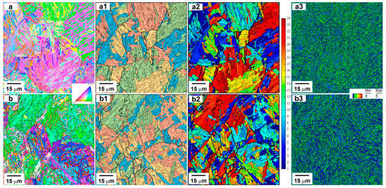 EBSD analysis of the Fe-0.34C steel after quenching (a–a3) and tempering at 500 °C (b–b3): (a,b) misorientation maps; (a1,b1) misorientation map showing HABs of the reconstructed PAGs and packets; (a2,b2) the K–S variant maps (in the K–S variant maps, black lines denote the reconstructed PAG boundaries); (a3,b3) KAM maps.