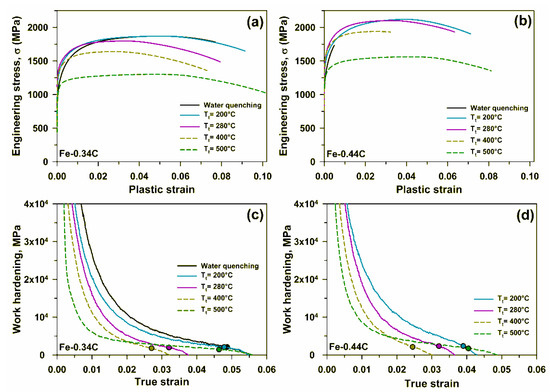 Typical engineering stress–strain curves (a,b) and strain hardening vs strain curves (c,d) of the Fe-0.34C steel (a,c); the Fe-0.44C steel (b,d).