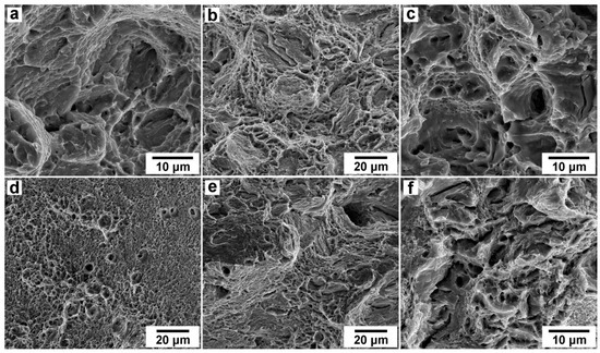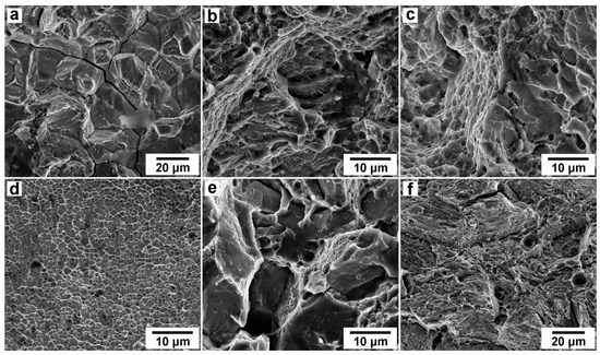 The fracture surfaces of the specimens machined from the Fe-0.44C steel and tensioned after quenching—fibrous zone (a); tempering at 200 °C—fibrous zone (b); tempering at 280 °C—fibrous zone (c); tempering at 280 °C—radial fracture zone (d); tempering at 400 °C—fibrous zone (e); tempering at 500 °C—fibrous zone (f).