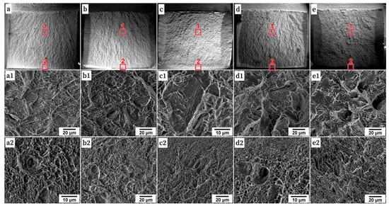 Low-magnification general view (a–e) and high-magnification fractographs of FCPZ (a1–e1) and SLZ (a2–e2) of the fracture surface in the Charpy V-notch specimens after water quenching (a–a2); tempering at 200 °C (b–b2), 280 °C (c–c2), 400 °C (d–d2), 500 °C (e–e2) of the Fe-0.34C steel.