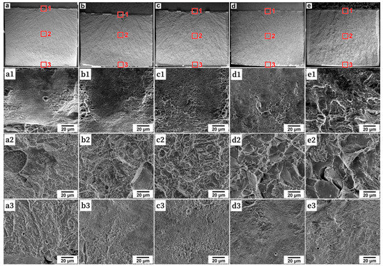 Low-magnification general view (a–e) and high-magnification fractographs of IZ (a1–e1), FCPZ (a2–e2) and SLZ (a3–e3) of the fracture surface in the Charpy V-notch specimens after water quenching (a–a3); tempering at 200 °C (b–b3), 280 °C (c–c3), 400 °C (d–d3), 500 °C (e–e3) of the Fe-0.44C steel.