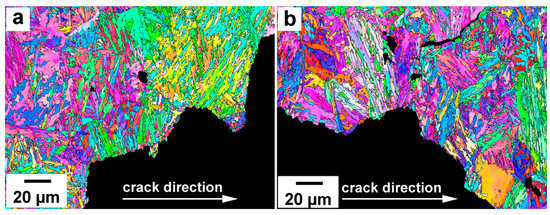 Figure 12 shows the side views of the crack propagation in the CVN specimens of the Fe-0.34C steel. The EBSD maps clearly reveal that a crack propagates through the martensitic matrix across the numerous laths on the common cleavage planes after tempering at 280 °C, hence, confirming transgranular fracture (Figure 11a). The almost flat surface of crack propagation occurs within two coarse packets, whereas the rugged surfaces are observed for blocks with distinctly distinguished orientations. Therefore, cleavage may propagate along a {100}α plane within a coarse packet, while propagation across blocks may lead to cleavage initiation along parallel {100}α planes in adjacent blocks. The intersection of the crack propagation path with packets having the other {111}γ habit plane leads to the re-orientation of the crack path at an angle close to 90°; crack propagation redirects along a perpendicular {100}α plane. Thus, block and packet/PAG boundaries serve as obstacles for crack propagation. However, cleavage propagation through block boundary leads to a transition to a parallel cleavage plane inclined to the primary cleavage plane at a small angle. The intersection of the propagation path with packet or PAG boundaries enables cleavage persistence along the other {100}α plane. These boundaries redirect the crack propagation at a high angle in a cleavage manner.