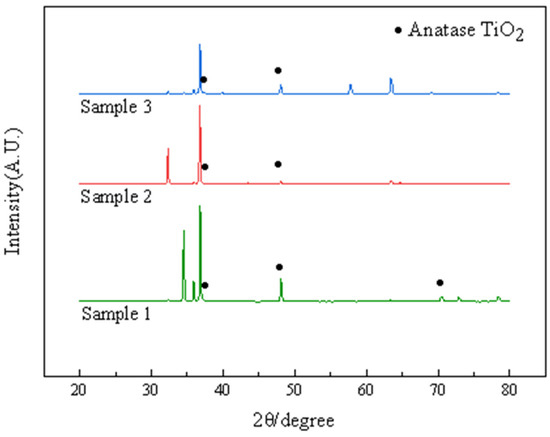 Figure 1 shows XRD patterns of samples. The peaks of anatase TiO2 were observed for samples 1, 2 and 3. This information along with the 2θ angle of the characteristic peak and the spatial point group of TiO2 in the related literature indicates that the coating provided was anatase TiO2.The analysis suggested that during the preparation of the sol, C16H36O4Ti provided the metal element, which underwent a hydrolysis and condensation reaction with water, and a small amount of hydrochloric acid controlled the rate of the hydrolysis reaction, which yielded TiO2. TiO2 powder was obtained by heating the sols coated on the sample surface for 30 min at 100 °C, and it was then deposited on the AZ91 surface through a 2 h heat treatment process performed at 300 °C to provide a TiO2 coating.