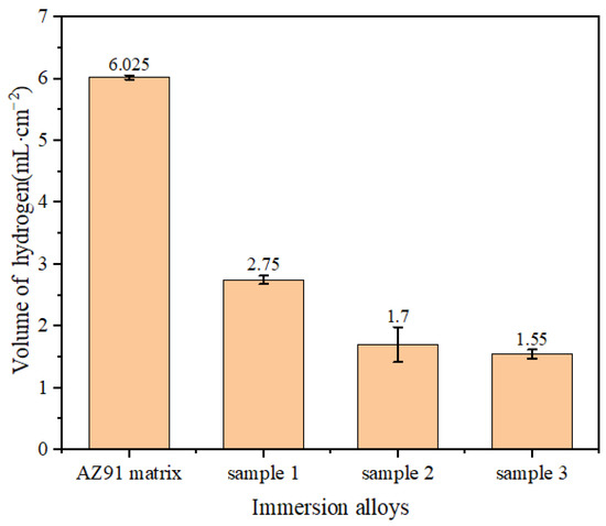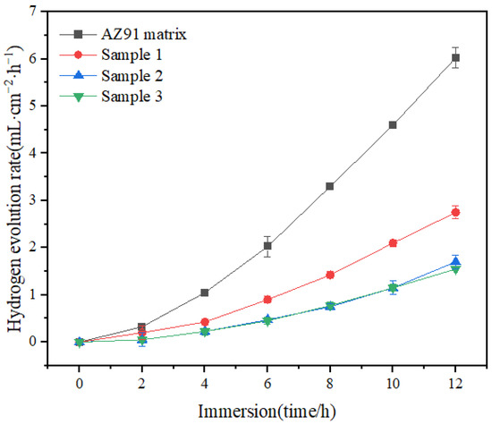 As shown in Figure 4, the rate of hydrogen evolution for samples 1, 2 and 3 was lower and their corrosion resistance was higher compared with the AZ91 matrix. The hydrogen evolution rates for the samples tended to level off. The rates for samples 2 and 3 followed similar trajectories to a certain extent, but ultimately, the rate of hydrogen evolution for sample 3 was lower.