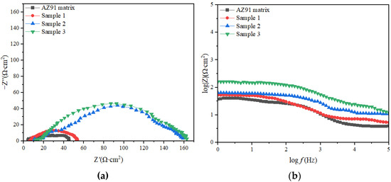 As shown in Figure 5a, the curve for the AZ91 matrix contained two capacitive arcs with small radii, and a small portion of the inductive arc was in the low-frequency region, indicating that part of the matrix surface was corroded [23]. The curves of samples 1, 2 and 3 had only one capacitive arc segment, and its radius was greater than that in the case of the AZ91 matrix. The corrosion mechanism of the AZ91 matrix was different from that of samples 1, 2 and 3, and the TiO2 coating caused the corrosion mechanism of the samples to differ. The TiO2 coating increased the resistance of the AZ91 substrate and effectively enhanced its corrosion resistance. Sample 3 had the best corrosion resistance [24].