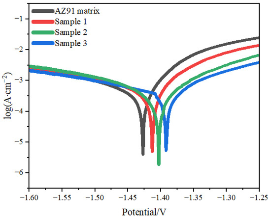 The corrosion potential and corrosion current density of the AZ91 matrix and samples 1, 2 and 3 are presented in Table 2(This data is obtained from Figure 6). Compared with the AZ91 matrix, the corrosion potentials of samples 1, 2 and 3 were higher by 100, 330 and 340 mV, respectively, and the corrosion current densities of these samples were lower by 55.4%, 89.8% and 91.7%, respectively [28]. Thus, samples 1, 2 and 3 had higher corrosion resistance than the AZ91 matrix, with sample 3 having the best corrosion resistance and sample 2 having the next best corrosion resistance.