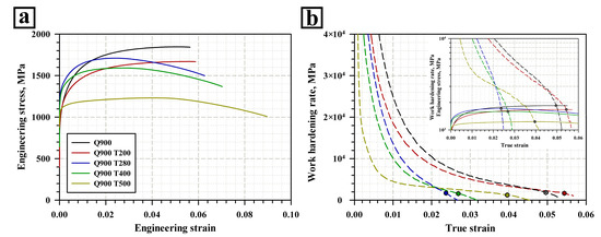 | Tempering Temperature, °C | YS, MPa | UTS, MPa | Elongation-to-Failure, % | PSE, GPa·% | Uniform Elongation, % | HRC |