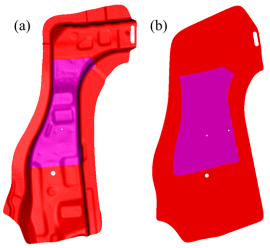 A-pillar patchwork blanks. (a) Part. (b) Blanks. Note: main blank red; patched blank purple.