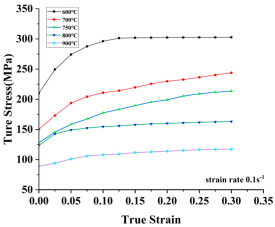 The thicknesses of the main blank and the patched blank are 1.2 mm and 1.5 mm, respectively, and the overall dimensions of the part are 692 mm × 380 mm × 115 mm, as shown in Figure 1. Uniaxial tensile tests of the 22MnB5 at different temperatures and strain rates were carried out using a Gleeble 1500 testing machine to obtain the stress–strain curves at different temperatures [26,27].The stress–strain curves of the material at different temperatures are shown in Figure 2. With the increase in temperature, the rheological stress of the material decreases.