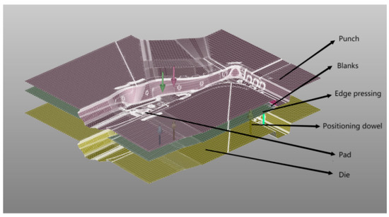 The dies’ arrangement for the hot stamping of the A-pillar patchwork blanks is shown in Figure 3. The friction coefficient was set to 0.45, and the heating temperature of the blank was 930 °C so as to render it completely austenitized [28,29]. The transfer time was 8 s, the tool temperature was 70 °C, and the stamping stroke was 200 mm. The waiting time of the blank in the die before the punch touched the blank was set to 2 s. The quenching time was 7 s, and the holding force was 5000 kN during quenching.