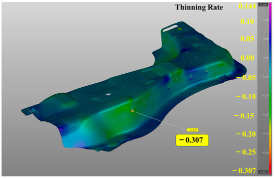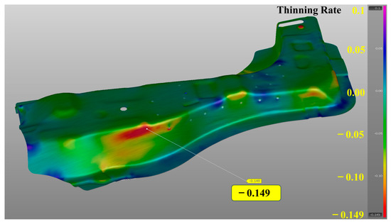 The simulation result obtained under the optimal solution conditions is shown in Figure 9. Compared with the maximum thinning rate of 30.7% (Figure 4) before optimization, the maximum thinning rate was significantly reduced to 14.9% after the optimization of the welding spots’ arrangement, which meets the hot-stamping production specifications.