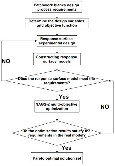 Figure 4 shows the simulation results without the optimization of the welding spots’ arrangement. In hot-stamping analysis, it is generally required that the maximum thinning rate of the material is no more than 17%; otherwise, the material is considered to be cracked. It can be seen that the thinning rate of the main blank around the welding spots on the sidewall is 30.7%, far exceeding the requirement of 17%. To reduce the excessive rate of thinning around the welding spots, the central composite design, response surface methods, and genetic algorithm multi-objective optimization method were used to optimize the formability of the A-pillar patchwork blanks, and the optimization process is shown in Figure 5.