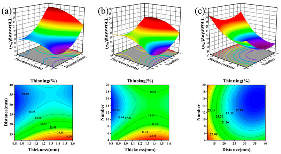 Response surface and contour line map of the three factors showing effects on the maximum thinning rate: (a) X1 and X2, (b) X1 and X3, (c) X2 and X3.