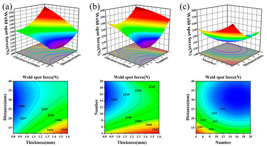 Response surface and contour line map of the three factors showing effects on the welding spots force: (a) X1 and X2, (b) X1 and X3, (c) X2 and X3.