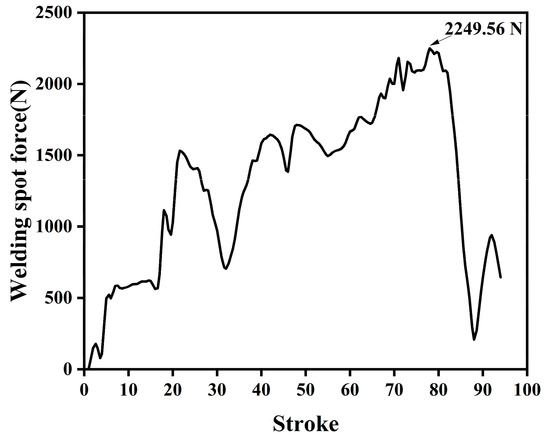 Figure 10 shows the evolution of the maximum welding spot force after optimization. With the increase in the punch stroke, the welding spot force increased, and the welding spot force decreased rapidly after reaching the maximum of 2249.56 N.
