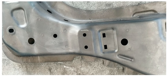 To further verify the influence of the optimized process parameters on the real hot-stamping quality, an A-pillar patchwork blank part was produced. The formed part is shown in Figure 11. With the plastic deformation of patchwork blanks, the position of the weld spots will change. When the weld spots were in the flange position, as the punch moved downwards, the weld spots moved to the die fillet area, and the force gradually increased. Near the corner of the die, the weld spot force was the greatest. When the weld spots entered the side wall area of the part, the resistance was reduced, so that the weld spot force was reduced. There were no crack or wrinkling defects in the formed part, and the welding spots were intact and met the quality requirements.