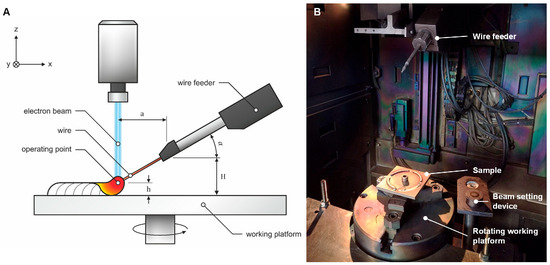 The experiments were carried out on an EBG15-150 K30 electron beam system (pro-beam GmbH & Co. KGaA, Gilching, Germany) which was equipped with a DIX WDE 515 wire feeding device (Dinse GmbH, Norderstedt, Germany). A constant accelerating voltage of 120 kV was set for all experiments. The vacuum quality during the experiments varied between 0.5 × 10−4 mbar and 1 × 10−3 mbar. The experimental setup is shown in Figure 1. The alignment between the wire feeder, electron beam and substrate is critical to the process [17]. The optimal settings for this were determined empirically in preliminary experiments and kept constant. The angle of inclination α of the wire conveyor was 30° with a distance of the wire tip to the surface H of 4.3 mm. The intersection point between the wire axis and the electron beam is referred to as the working point, which had an offset from the substrate surface h of 2 mm. The working distance between the deflection coil and the working point was 880 mm. As a welding figure, concentric circles with an amplitude in X as well as Y direction of 2–4 mm, depending on the parameter set, were used in the surface focus of the workpiece.