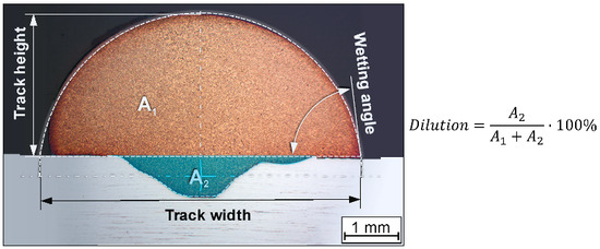 The volumetric energy is also limited in the upward direction. For example, large energy inputs cause the melt to deviate strongly. The track width increases sharply while the track height decreases since the wetting behavior changes due to the overheating of the melt. This can be easily seen from the measured wetting angle in Figure 4D.