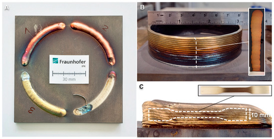 (A) Single tracks for initial tests on energy input, dilution and scalability; (B) Additively manufactured cylinder and position of sample extraction for hardness profile and microstructure; (C) Additively manufactured wall and position of the tensile specimens.