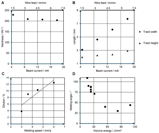 (A) Hardness over scaling; (B) development of track geometry over scaling; (C) dilution over welding speed; (D) dependence of the wetting angle on the volumetric energy.