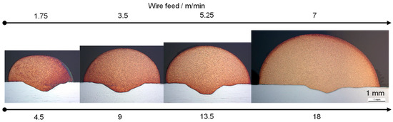 After suitable ranges for volume energy and welding speed have been determined, the next step is to test the scalability of the process in order to ensure individual influencing of the track geometry while maintaining the same component properties for the additive buildup. For this purpose, the parameters of wire feed and beam current were increased stepwise by the same factor while welding speed and volume energy remained constant. An overview of the development of the track geometry with a stepwise increase in the deposition rate is shown in Figure 5 on the cross-sections of the samples. Deposition rates of 0.6–2.5 kg/h can be realized for the alloy CuAl8Ni6. In the literature, deposition rates for comparable Cu alloys at DED-EB are about 1.9 kg/h and thus within the investigated range [20]. For pure copper and low-alloy copper materials, Baufeld et al. achieved values for the DED-EB of 1.5 kg/h to 3.3 kg/h, although the higher density of the material must be taken into account here [21]. In order to obtain a rough estimation of the influence of the scaling on mechanical parameters, hardness measurements are carried out. The result of these measurements, as well as the development of the track geometry, are shown in the form of diagrams in Figure 4A and in relation to wire feed and beam current. There is a slight decrease in hardness with a gradual increase in beam current and wire feed. The hardness values achieved above 200 HV1 are within a normal range for the material. They thus correspond to qualities achievable by other AM processes for Al bronzes, such as DED-Arc [12]. The course of the hardness is relatively constant over the increase in beam current and wire feed. Only the hardness value of the lowest setting is slightly above the other samples.