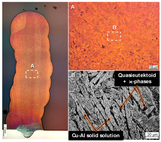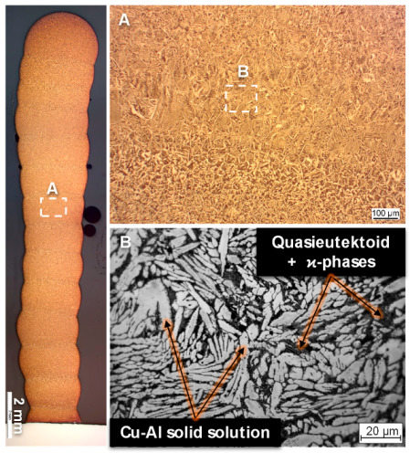Figure 6 shows the microstructure of the thin-walled cylinder Z1. The macroscopic overview image of the section shows a roughly uniform and fine-grained microstructure over the entire height of the cylinder. The individual layers can be identified on the basis of dark regions of partially remelted material. The detailed images show a dendritic shape of the grains with segregations of other phases at the grain boundaries. These phases are most likely Fe- and Ni-rich phases, so-called ϰ-phases. Such microstructures are common in aluminum bronzes of similar composition and correspond to the microstructure of die castings. The visible bright needle-shaped grains are, therefore, dendritic solid solutions of Cu and Al embedded in a quasieutectoid matrix [25].