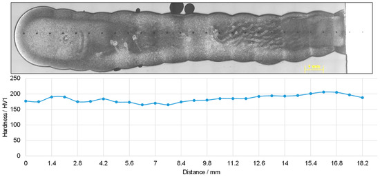 Figure 8 shows the hardness profile of specimen Z1. The plot of the graph shows slight local variations of the hardness value over the height of the cylinder wall. The measured hardnesses are in the range of approx. 160 HV1 to 210 HV1. At the lower end of the specimen, in the right area of the graph, there is a slight trend towards an increase in hardness, which can be attributed to the faster cooling and the changed heat dissipation at the beginning of the build process on the cold plate. The hardness trend over the height of the specimen is relatively uniform overall and shows no significant deviations.