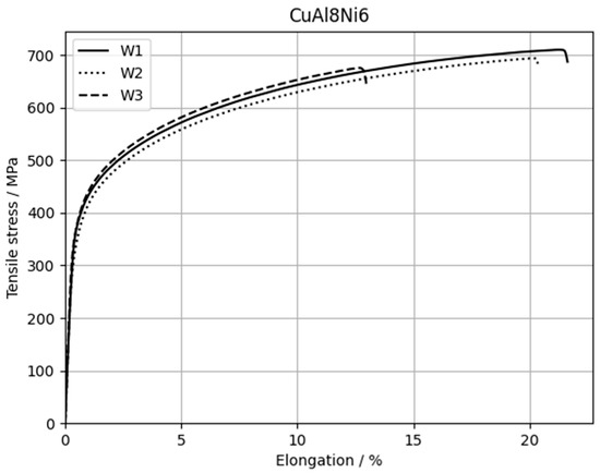 The results of the tensile tests for yield strength, tensile strength and elongation at fracture are listed in Table 3. The three samples were manufactured and tested with the same parameters in order to statistically evaluate the variation of the results. The graphs for the tensile tests of the individual specimens are shown in Figure 10. The evaluation of the tensile tests for the alloy CuAl8Ni6 shows average values for the yield strength of approx. 369 MPa, for the tensile strength approx. 693 MPa and an average elongation at a break of 18%. While specimens W1 and W2 show a good agreement of the material behavior, and the values of specimen W3 are somewhat below the others. On average, however, the values achieved meet the material specifications of the wire manufacturer. Thus, the data sheet specifies a yield strength of approx. 380 MPa, a tensile strength of 600 MPa and an elongation at break of 16%. In the case of specimens W1 and W2, the values for tensile strength and elongation at break are even significantly exceeded for the specimens manufactured by DED-EB. One reason for this could be the special cooling conditions of the buildup process carried out in a vacuum. In the case of the alloy used, this favors the formation of a ductile microstructure of Cu-Al solid solutions. Due to the contents of Ni and Fe, the alloy exhibits a fine microstructure despite the high heat input in the buildup process [3]. Considering the known alloy behavior, it can be assumed that the reheating in the continuous buildup process, in combination with the slow cooling by the vacuum, also suppresses the precipitation of brittle β-phases in favor of the solid solutions and produce an accumulation of finely divided ϰ-phases [8].