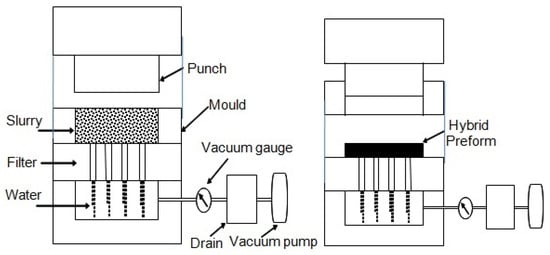 The properties of the reinforcements of GNF and Al2O3sf are presented in Table 1. The hybrid preform using GNFs and Al2O3sf was fabricated using various total volume fractions of fibers, such as 10 vol.%, 15 vol.%, and 20 vol.%. The volume percentage of GNFs and Al2O3sf were maintained as 30% and 70%, respectively. The schematic diagram for the fabrication of the preform is shown in Figure 1. Initially, Al2O3sf and GNFs were mixed in the selected ratio with distilled water and the required amount of binder (10%). The level of mechanical agitation was carefully controlled to avoid the damage to the Al2O3sf and GNFs. Then, cationic polyacrylamide, NaDDBs, and starch (5% each of the total weight of fibers) were added. Subsequently, ultrasonic agitation was employed for a proper mixing of the additives in the distilled water medium. By using a vacuum pump the water was removed and the preforms were pressed by a punch to the desired thickness. Thereafter, the fabricated preforms were taken from the mold and baked at 200 °C. Finally, laboratory scale hybrid preformswith lengths of 60 mm, widths of 20 mm, and thicknesses of 15 mm were developed successfully. The details of the fabrication of hybrid preform and its mechanical properties have been described elsewhere [19].