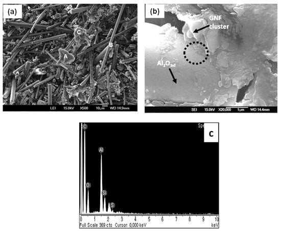 SEM images of (a) GNFs/Al2O3sf hybrid preform; (A,C)—GNF cluster, B—Al2O3sf, (b) GNF cluster and Al2O3sfbonding, (c) EDS analysis of (b) in the dotted circle.