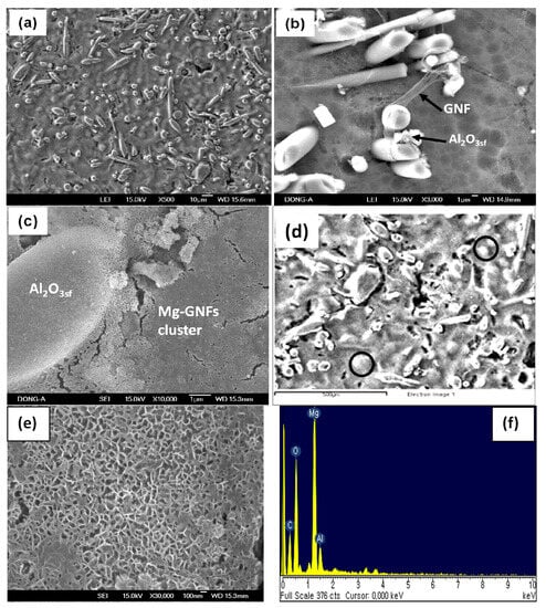 SEM images of (a) Mg/GNF/Al2O3sf, (b) bonding of GNF and Al2O3sf within the Mg matrix, (c) Mg infiltrated GNF cluster network, (d) Mg17Al12 precipitates (white regions), (e) higher magnification of GNF cluster, (f) EDS analysis of SEM image of (d) in the circle region.