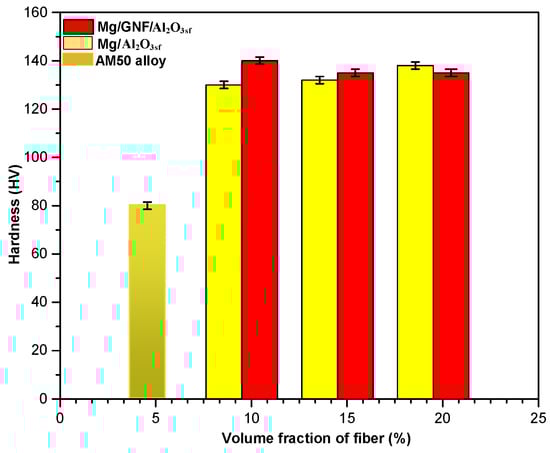 Figure 5 shows the microhardness of Mg/GNF/Al2O3sf hybrid composites. The hardness evaluation was performed on different regions of the sample using a Vickers hardness tester at load of 100 gf, and an average value was taken. The obtained results show that the hardness of Mg/GNF/Al2O3sf hybrid composite is higher than that of Mg/Al2O3sf. This increase in hardness is due to the better load sharing between GNFs and Al2O3sf within the Mg matrix and is also accounted for in terms of the resistance of dislocation movements caused by adding GNFs [24]. The hardness decreases at higher volume fraction of fiber attributed to the possible indentation near the GNF cluster within the Mg matrix. Moreover, it is expected that residual thermal stresses can be produced at the interfaces due to the thermal mismatch between the GNFs/Al2O3sf and the Mg matrix. This can also contribute to the reduction in the hardness of the composites [25].