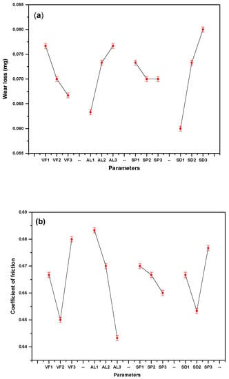 Mean response graphs; VF1, VF2, VF3—volume fraction of fiber, AL1, AL2, AL3—applied load, SP1, SP2, SP3—speed, SD1, SD2, SD3—sliding distance. (a) Wear loss, (b) coefficient of friction.