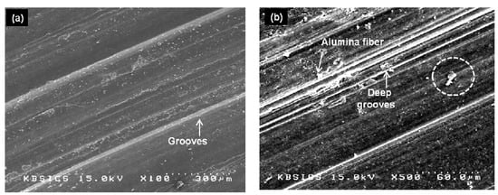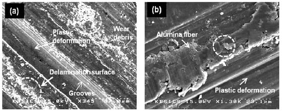 Typical SEM images show the wear worn surfaces of the hybrid composites with 10 vol.% testing at 100 N and 500 N (Figure 7). The figure shows the worn surface of composites tested at 100 N; the result of abrasion by bonding of Al2O3sf and GNFs as a slight ploughing can be observed. The material delamination is not severe on the sample, hence, the grooves are finer on the worn surface as shown in Figure 7a. In the case of the sample tested at 500 N wider grooves appeared on the worn surface due to abrasive wear, as a result, the wear loss is higher. In addition, reattachment of wear debris onto the worn surfaces due to higher applied load can be clearly seen (Figure 7b). The increase in applied load resulted in severe plastic deformation of the worn surface in the sliding direction [30]. In the case of hybrid composites with 15 vol.% tested at 100 N and 500 N (Figure 8), the grooves are finer and smaller debris formed on the worn surface. Moreover, the ploughing grooves were observed on the worn surface. This indicates the removal of material by delamination and a mild damage of a worn surface in the composite being found (Figure 8a). The plastic deformation of the matrix can be restricted due to the GNF cluster within the Al2O3sf network, and supports a barrier to the movement of dislocation, resulting in higher wear resistance. This leads to a smoother worn surface and higher degree of sliding action, which result in a reduction of the coefficient of friction. The reattachment of wear debris can also be seen on the worn surface. The adhesive and abrasive wear of the hybrid composites is slighter than that of the mono-composites due to the presence of GNF clusters, which act as self-lubrication material; this effect is induced by carbon and it reduces the coefficient of friction [31]. However, for the worn surface of the composites tested at 500 N a large extent of material flow and a scuffing tendency have been observed (Figure 8b). Moreover, a scar due to plastic deformation by ploughing is observed and the worn surface was severely deformed. Normally, on the worn surface, micro-cracks and voids are induced due to the plastic formation of composites [32].