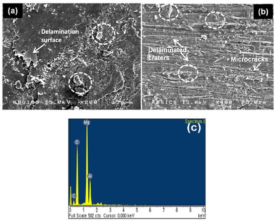 Figure 9a,b shows the typical SEM images of worn surfaces of composites with 20 vol.% at 100 N and 500 N. At lower load there were signs of the formation of micro-cracks and grooves in the worn surface, but it seems that in some regions agglomerated debris was formed, suggesting that the strain hardening effect induces debris and severe deformation on the surface by ploughing [33]. Furthermore, the worn surface indicates the presence of delamination surfaces and GNF cluster debris, as shown in Figure 9a, which appear to be bonded within the worn surface of the composites. From Figure 9b, it can be clearly seen that the worn surface was a smeared layer due to scuffing, and delaminated craters are more on the surface of the sample tested under higher load. Figure 9c shows that for the EDS analysis of the worn surface the absence of Fe content indicates that the abrasive material transition has been taken place instead of adhesion. In the profile a small peak can observed; this may be due to the presence of the Al2MgC2, which weakens the worn surfaces and results in the enhancement of wear resistance. The percentage of aluminum level is higher than 0.6% and less than 2%, resulting the formation of carbide at the interface of the Mg alloy and graphite fiber [34]. In addition, the fiber fragmentation effect was not observed due to the higher applied load while wear testing. Moreover, when the applied load is low, no plastic deformations occur in the worn surface. This is because of the decreased degree of abrasive wear mechanism during wear testing [35].