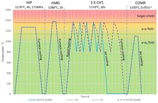 Idealised temperature-time profile of air cooling cyclic heat treatment and furnace cooling cyclic heat treatment, including consolidation (HIP), homogenisation (HMG), and five cycles of induction cyclic heat treatment (CHT) of 4822 before compression (COMP).