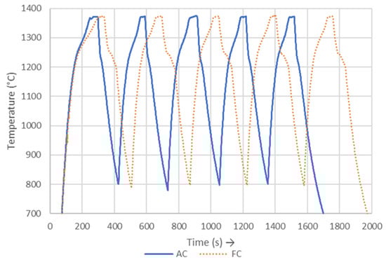 Recorded temperature–time profiles of (AC) air cooled cyclic heat treatment and (FC) furnace cooled cyclic heat treatment obtained with AMETEK Land SPOT pyrometer.
