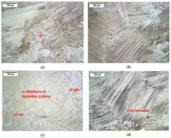 The initial grain refinement of the HH microstructure is the aim of cyclic heat treatments (CHT) to reduce or avoid hot working altogether. Other authors have looked to CHT to achieve refined fully lamellar (RFL) microstructures; Wang et al., in particular, pursued the grain refinement of peritectic alloys of 1 mm lamellar colony size to ≤50 μm, with the aim of avoiding hot working [,,]. They described the importance of several parameters of the CHT process, including prior α transus homogenisation and the effect of the cooling rate on microstructure formation. Phase and microstructural transformations at different cooling rates were reviewed in greater detail by Ramanujan [].