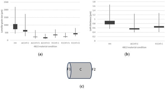 (a) Lamellar grain size (maximum, minimum, and inter-quartile range) and (b) lath thickness (maximum, minimum, and inter-quartile range) visualised for each material starting condition using OM analysis. (c) Diagram of compression sample, where C = centre, F1 = one face, F2 = the face opposite to F1, for post heat treatment analysis.