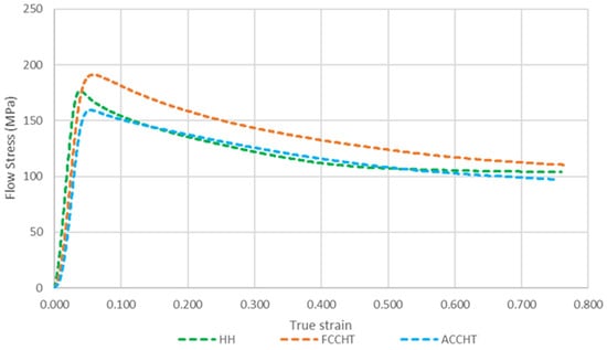 The differences in the flow curves of the three material conditions, the values of σpfs and εc, and the subsequent softening are due to the initial microstructure and potential to either orientate or globularise the lamellar content. FCCHT showed the highest value of σpfs, likely due to a fine fully lamellar microstructure, and ACCHT showed the lowest σpfs, probably due to low lamellar content and the lowest grain size. All CHT material moved towards stable material flow under these compression conditions; HH material, on the other hand, exhibited non-uniform deformation (see Table 4), with the highest rate of strain hardening, the earliest εc, and relatively sharp σpfs characterising its flow behaviour.